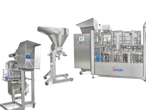Vorbefüllte Becher werden in den Drehteller eingesetzt um ein weiteres Produkt aufzudosieren.